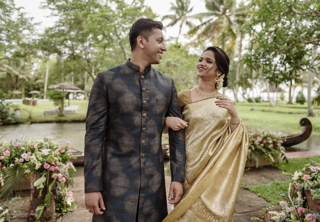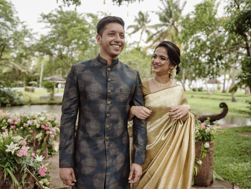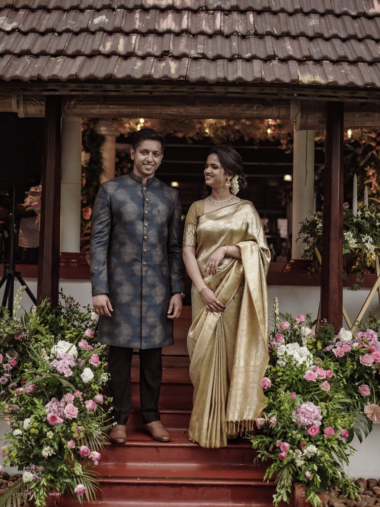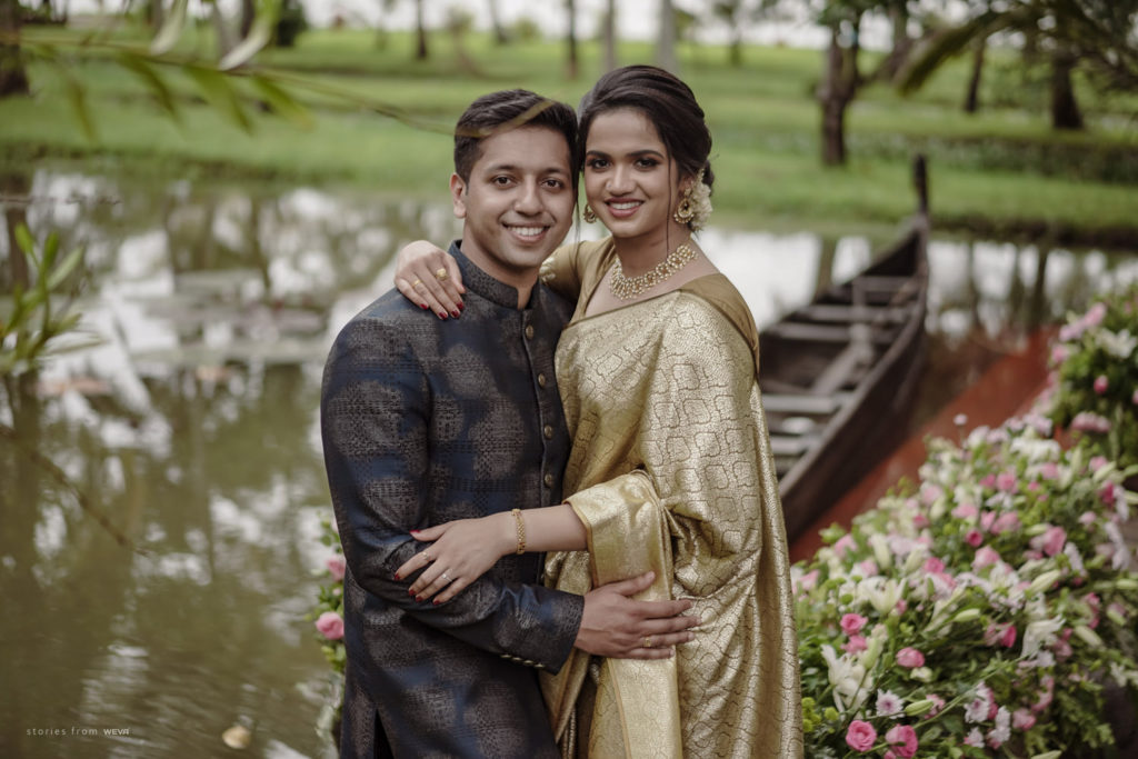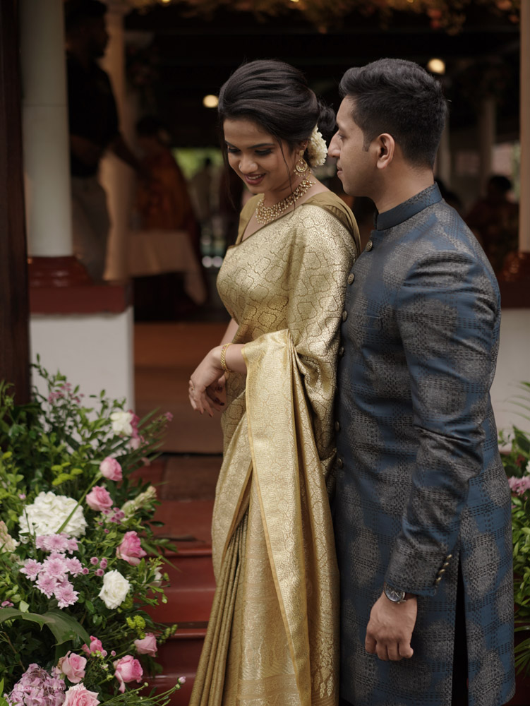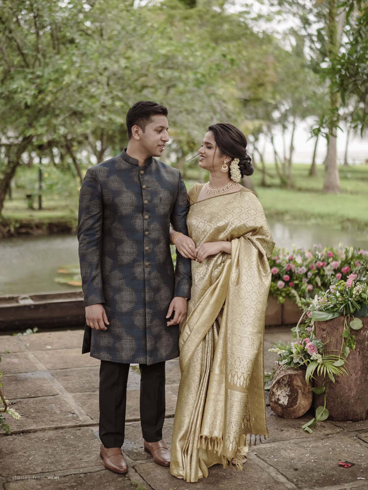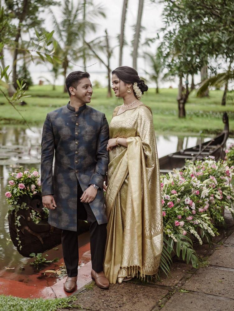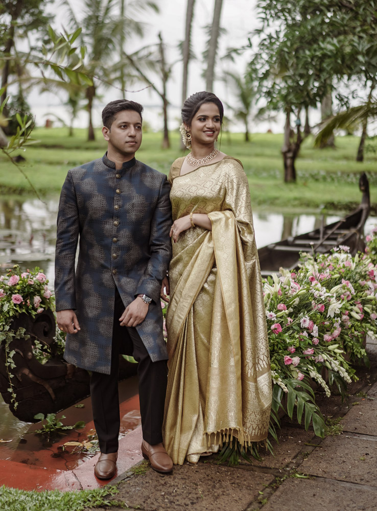 The regal engagement ceremony of our stunning couple Shikha & Gracious was inexplicably elegant in every single element. From enormous floral decor to a brief boat trip around the refreshing greens of Kumarakom backwaters, we are utterly speechless about the grace of their engagement bash held at Cocoon Lagoon – CGH Earth Resort. Shikha dolled up in a classic beige silk saree with a beautiful sheen. Her ‘into the camera eye’ portrait is quite a head-turner with her vibrant smile.