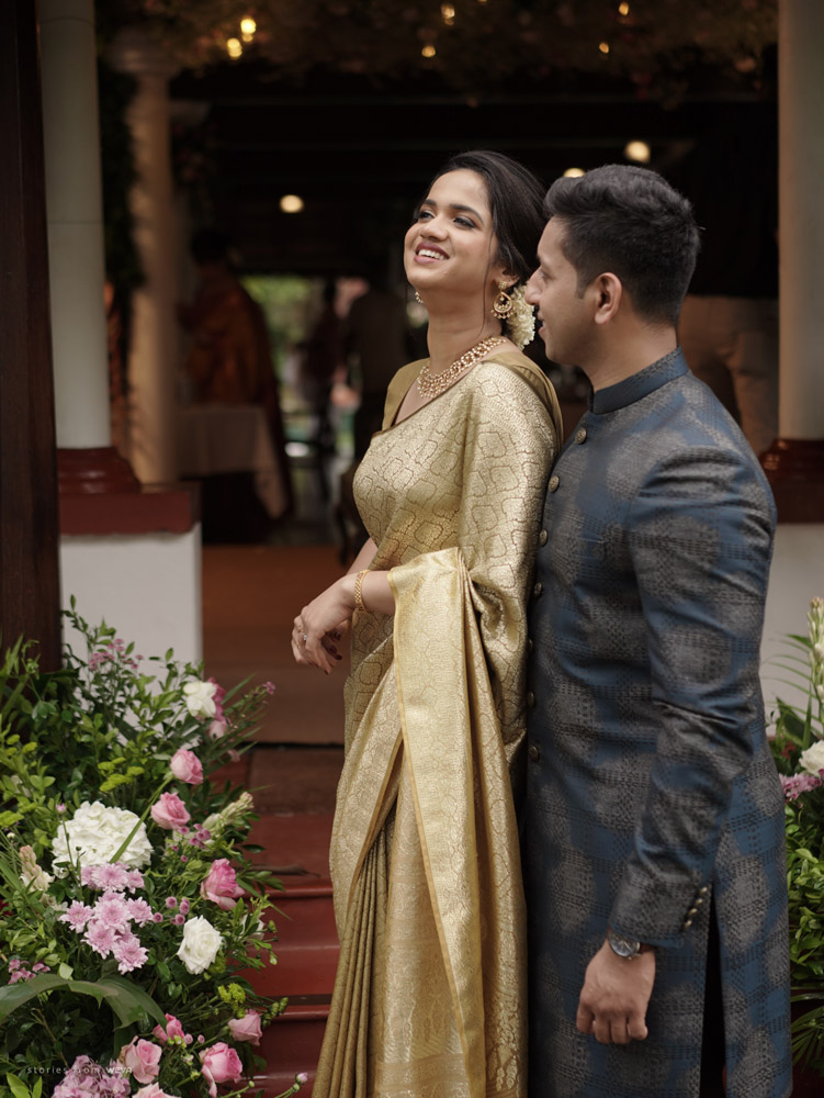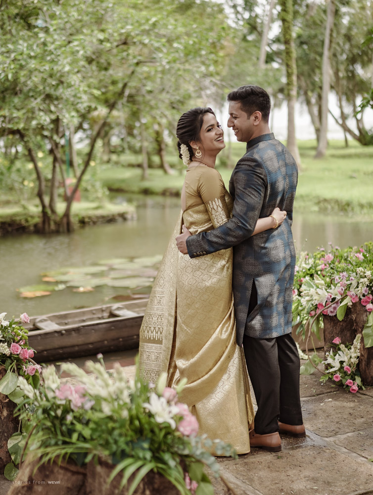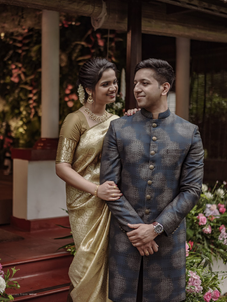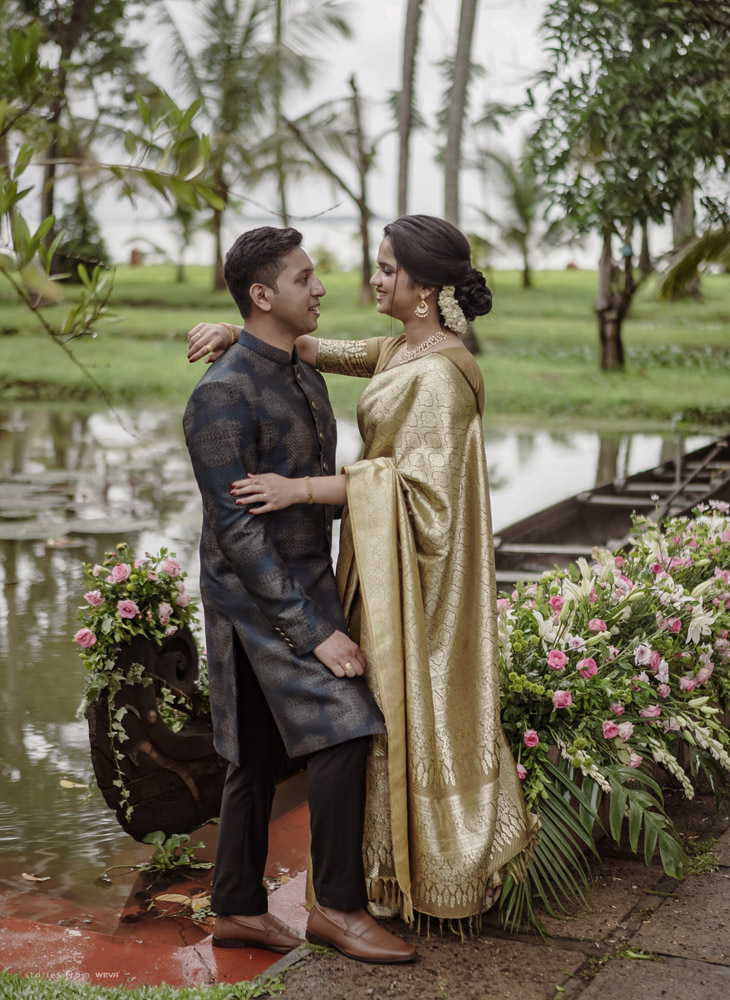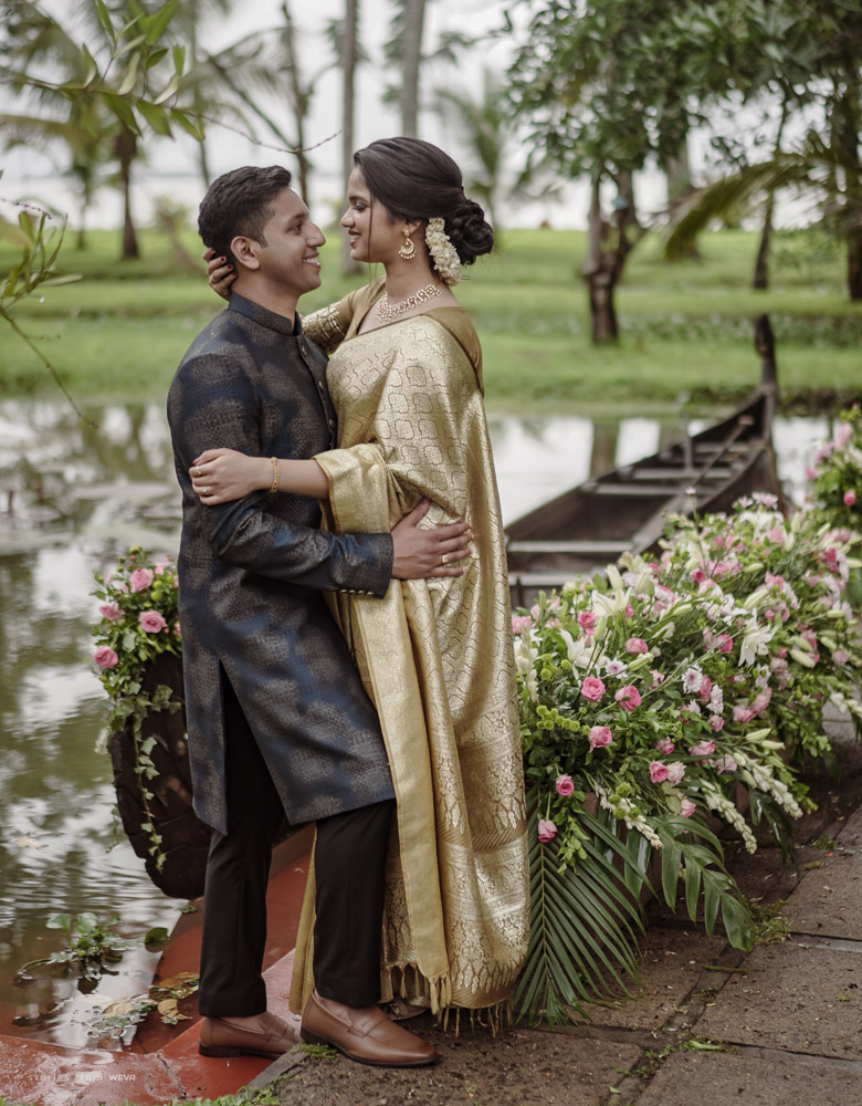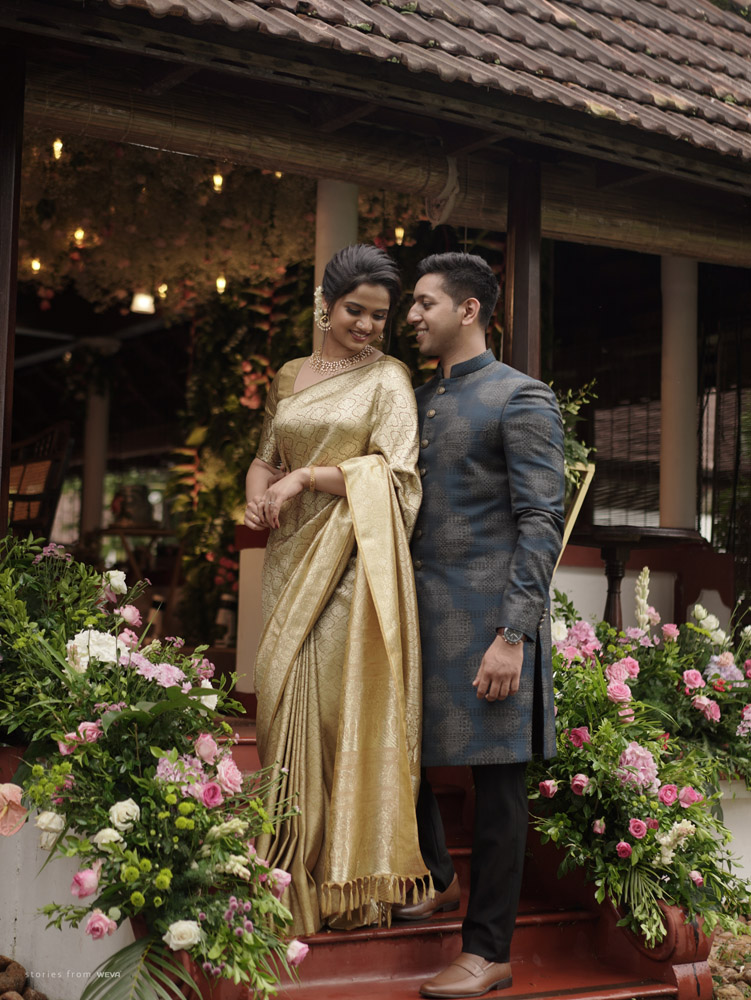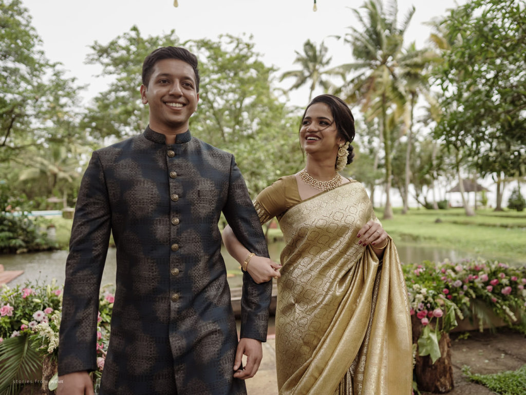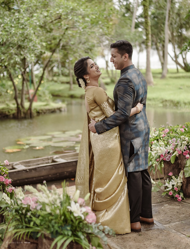 The regal engagement ceremony of our stunning couple Shikha & Gracious was inexplicably elegant in every single element. From enormous floral decor to a brief boat trip around the refreshing greens of Kumarakom backwaters, we are utterly speechless about the grace of their engagement bash held at Cocoon Lagoon – CGH Earth Resort. Shikha dolled up in a classic beige silk saree with a beautiful sheen. Her ‘into the camera eye’ portrait is quite a head-turner with her vibrant smile.