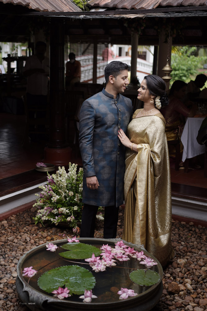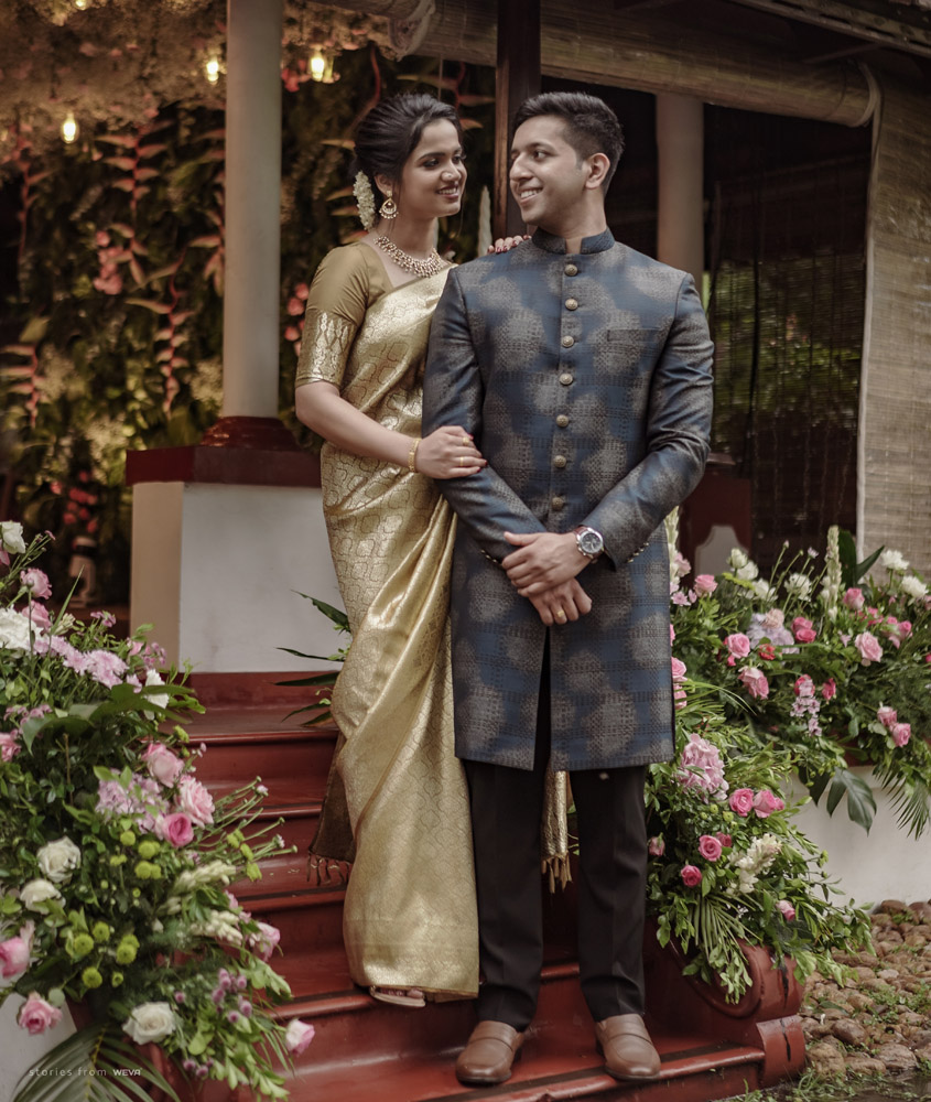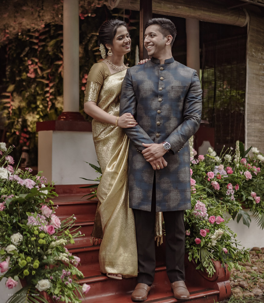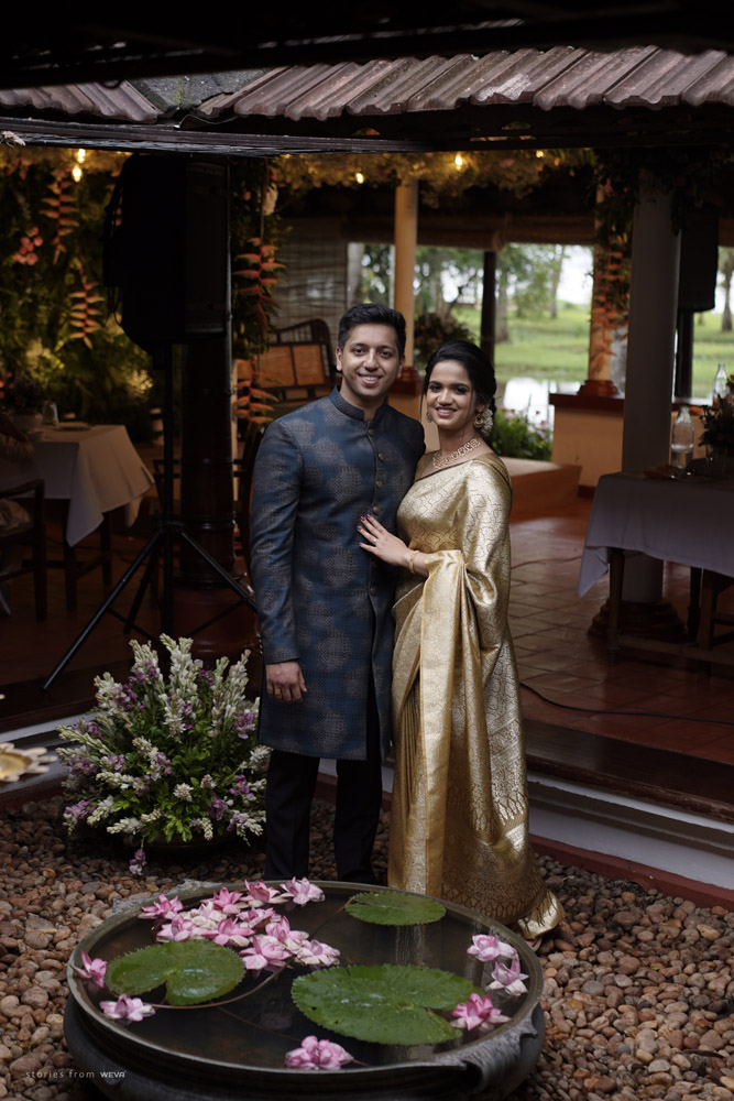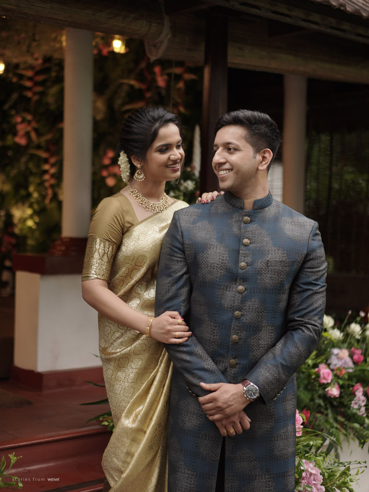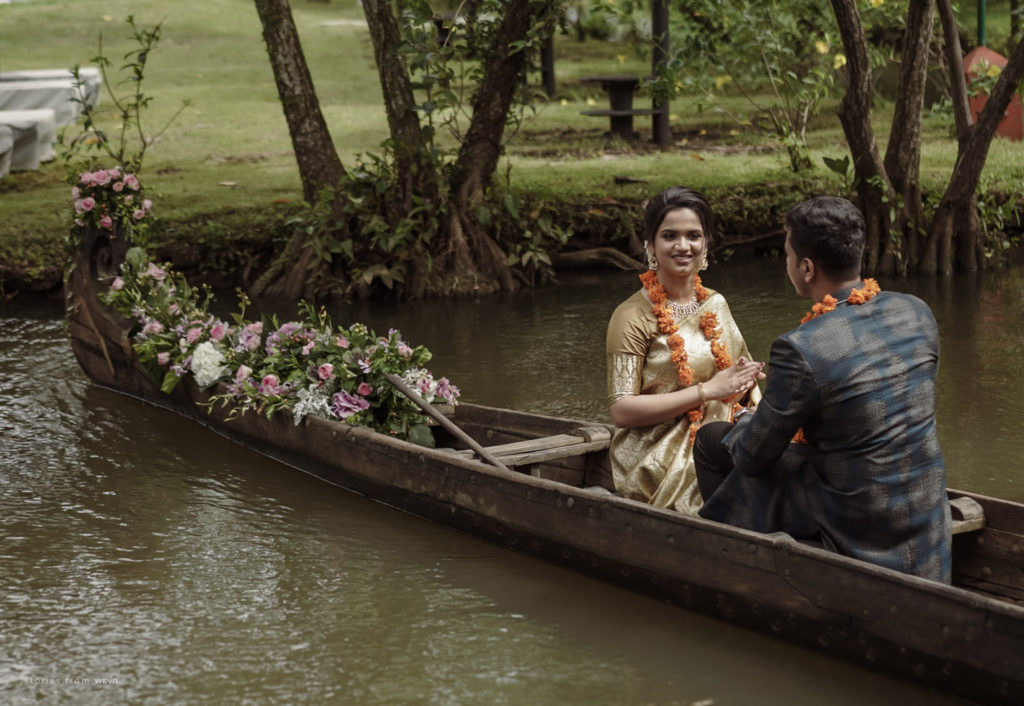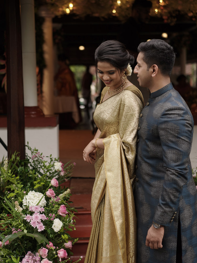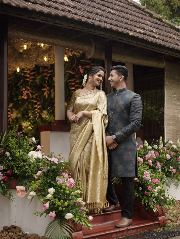 The regal engagement ceremony of our stunning couple Shikha & Gracious was inexplicably elegant in every single element. From enormous floral decor to a brief boat trip around the refreshing greens of Kumarakom backwaters, we are utterly speechless about the grace of their engagement bash held at Cocoon Lagoon – CGH Earth Resort. Shikha dolled up in a classic beige silk saree with a beautiful sheen. Her ‘into the camera eye’ portrait is quite a head-turner with her vibrant smile.