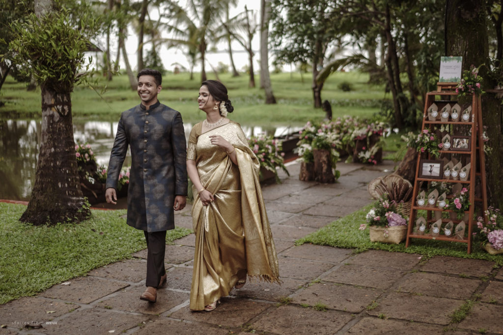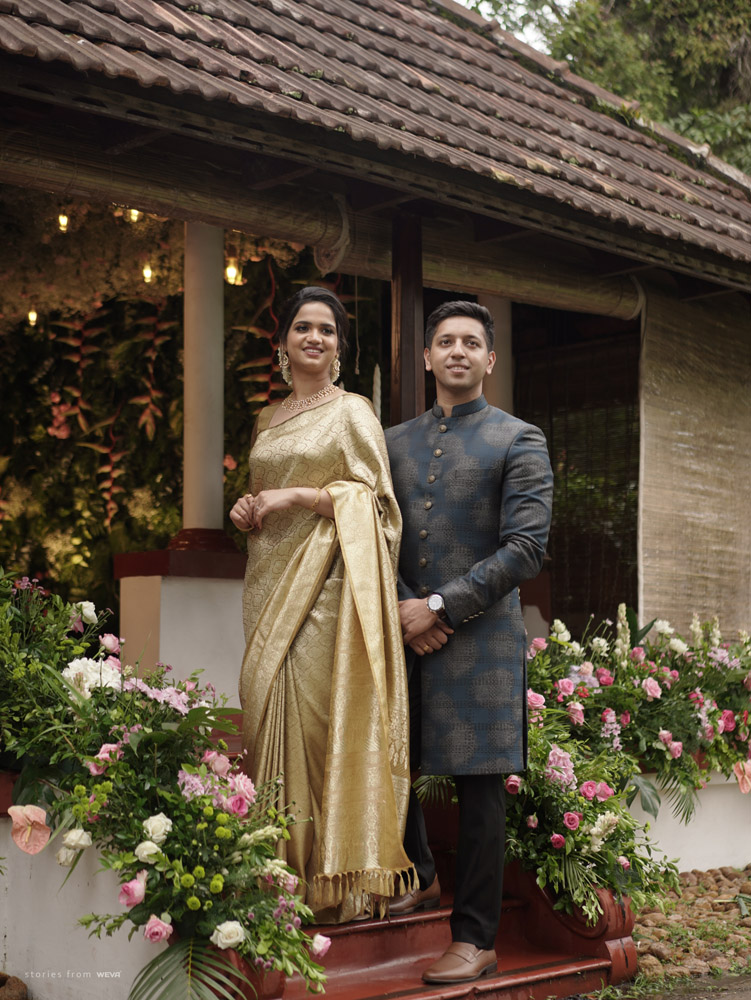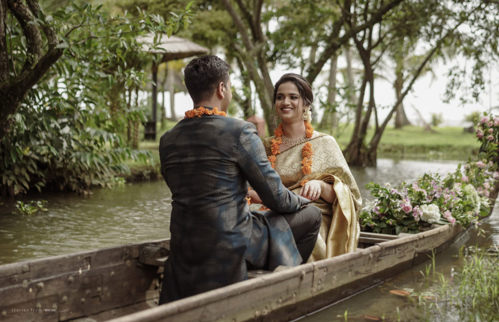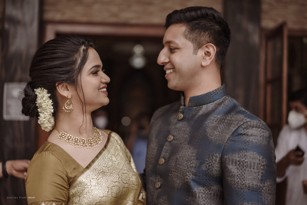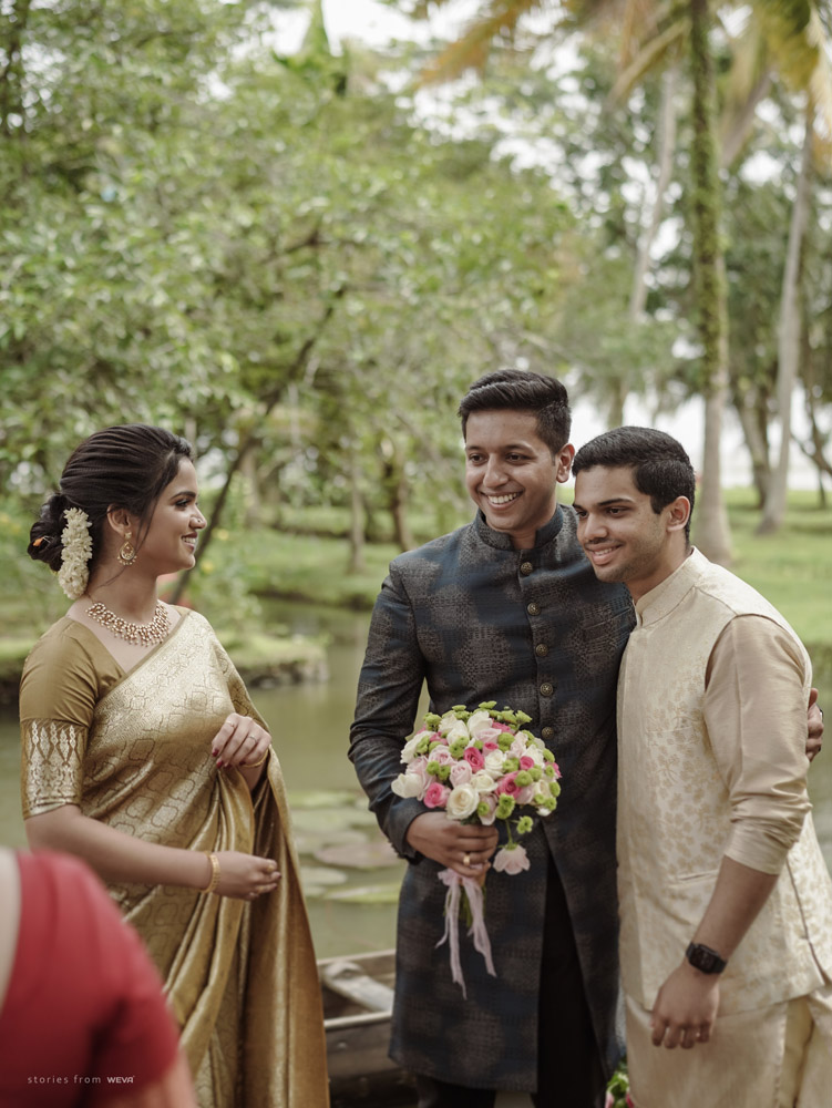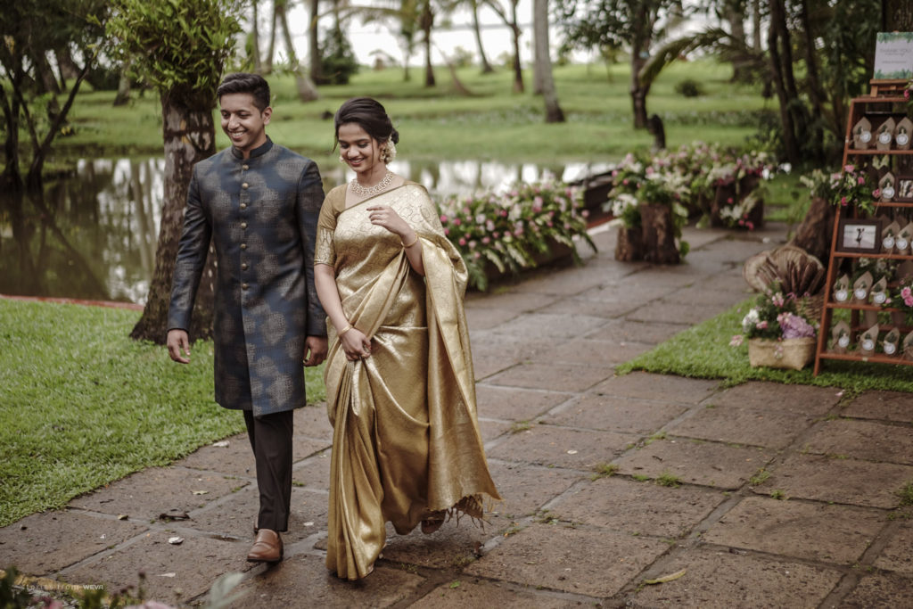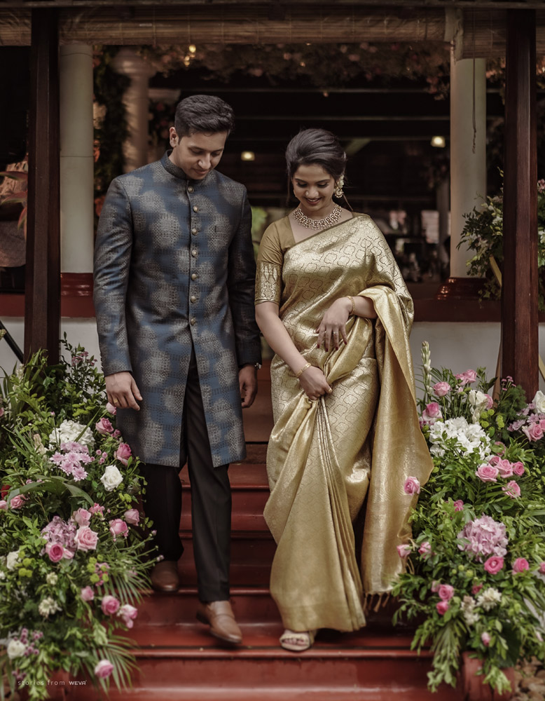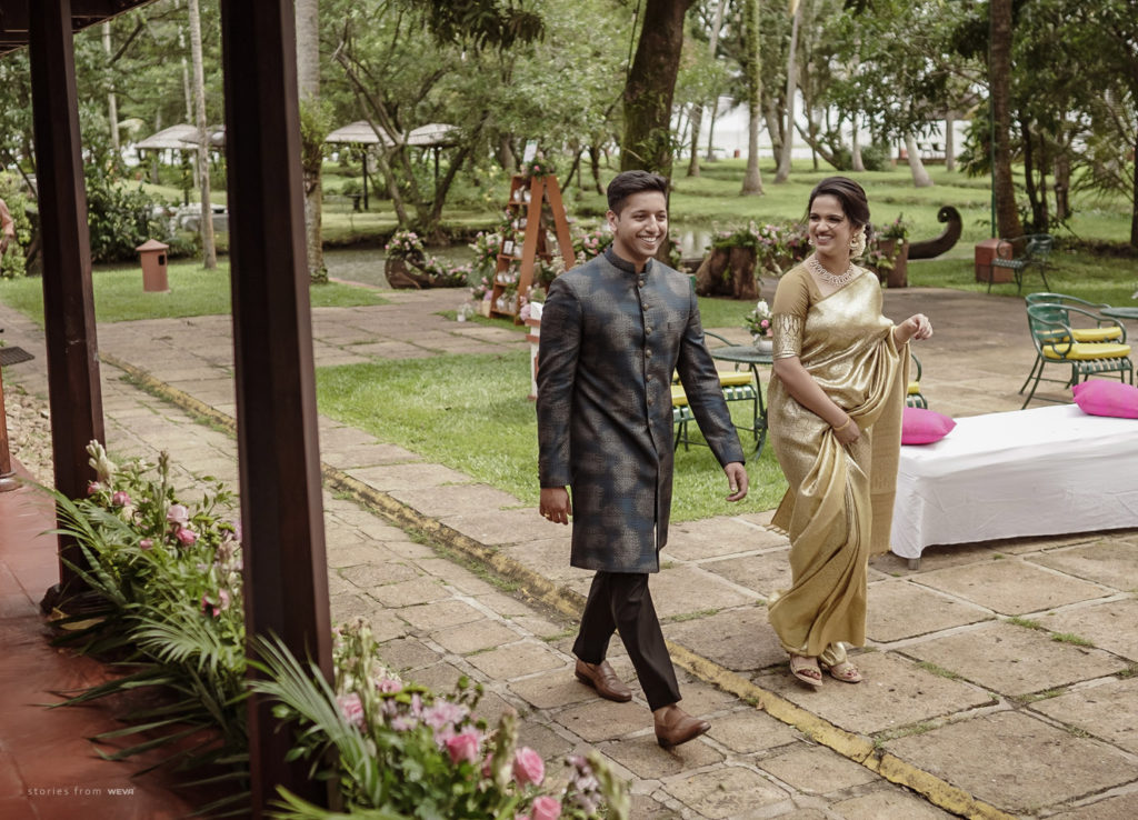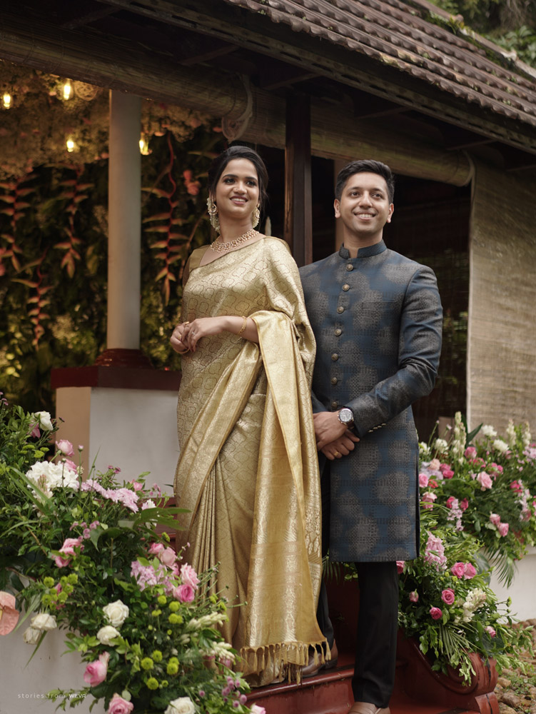 The regal engagement ceremony of our stunning couple Shikha & Gracious was inexplicably elegant in every single element. From enormous floral decor to a brief boat trip around the refreshing greens of Kumarakom backwaters, we are utterly speechless about the grace of their engagement bash held at Cocoon Lagoon – CGH Earth Resort. Shikha dolled up in a classic beige silk saree with a beautiful sheen. Her ‘into the camera eye’ portrait is quite a head-turner with her vibrant smile.