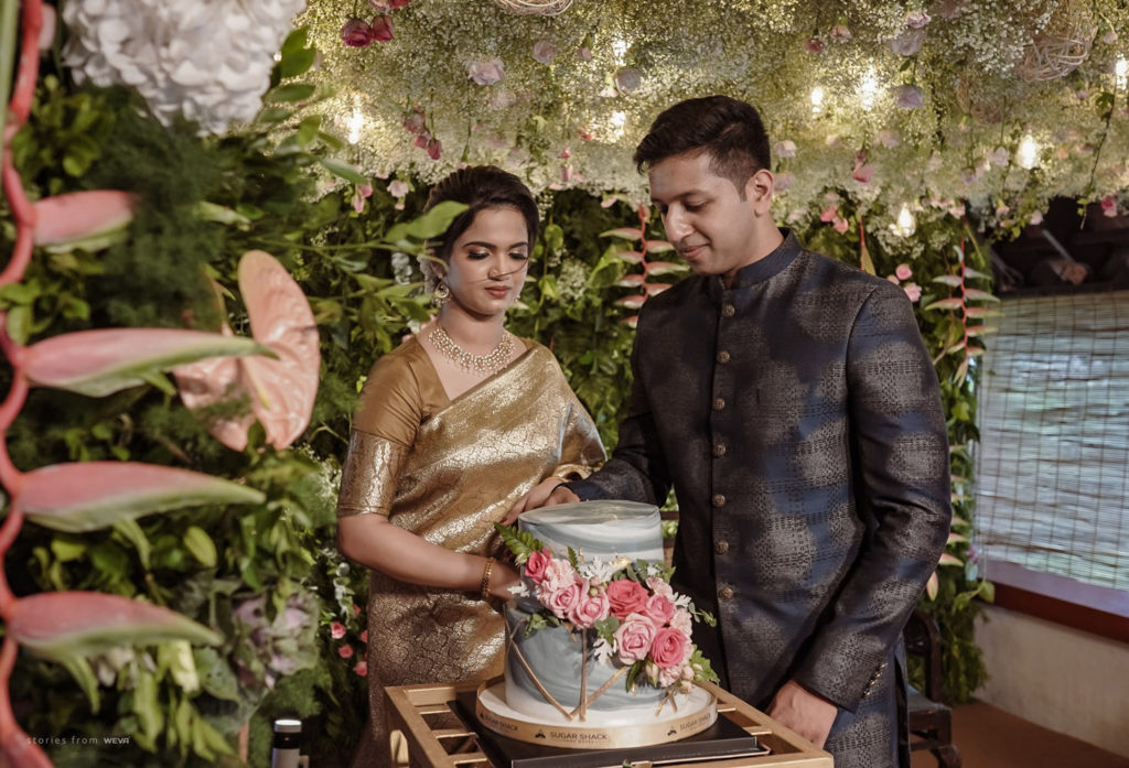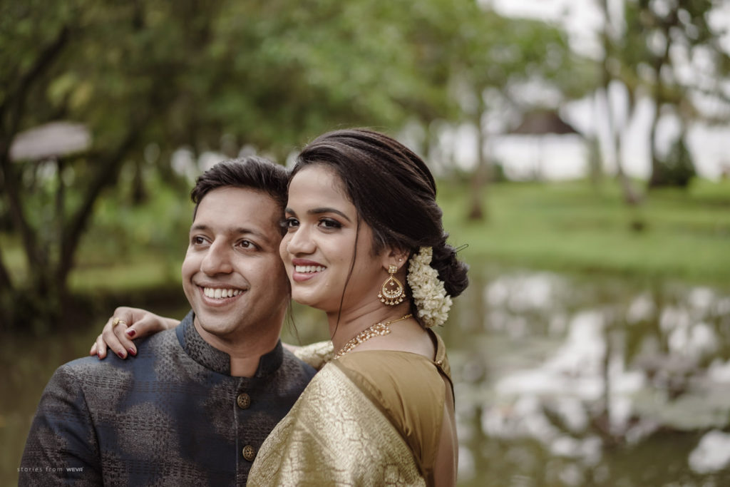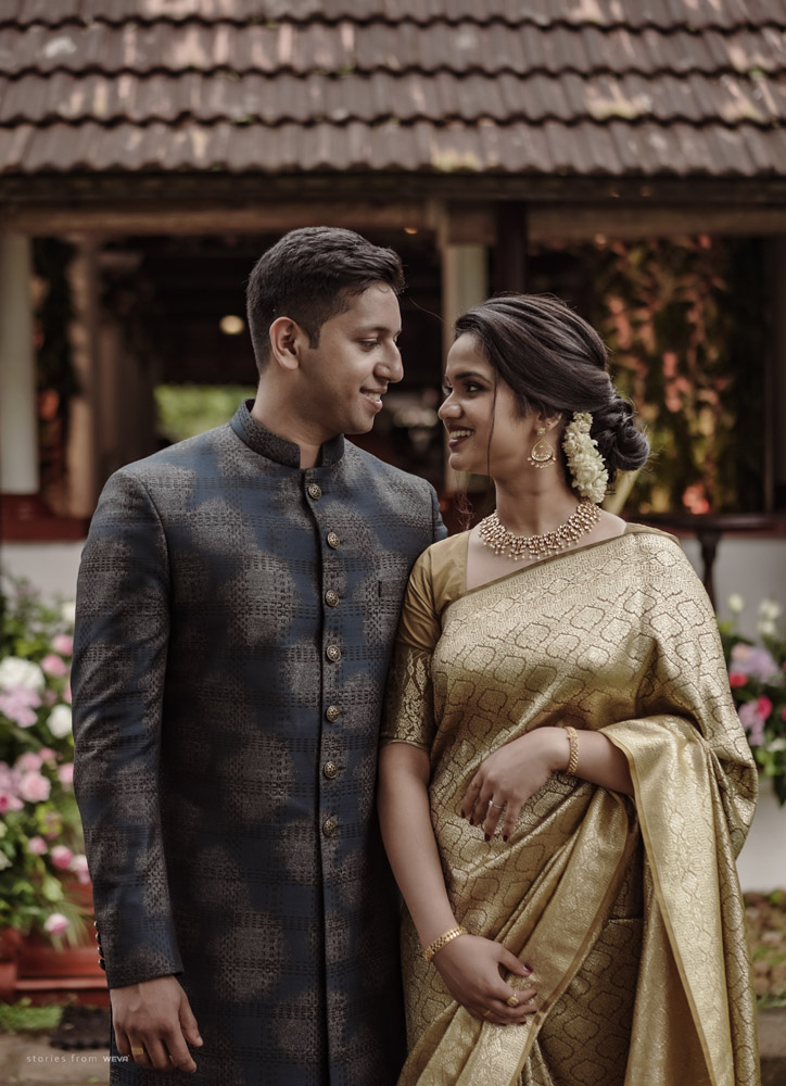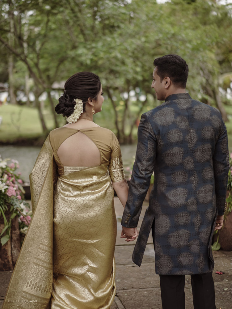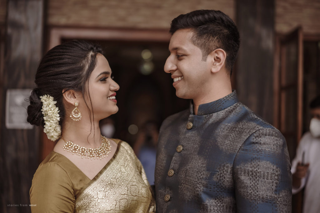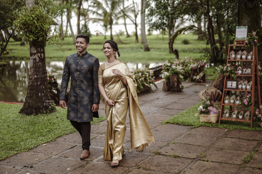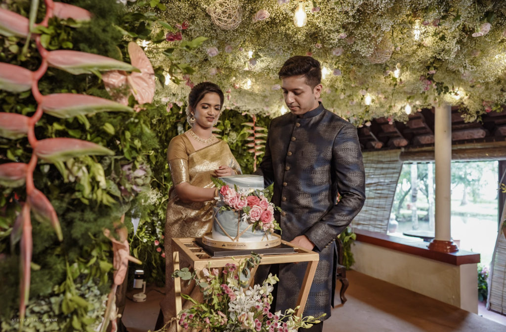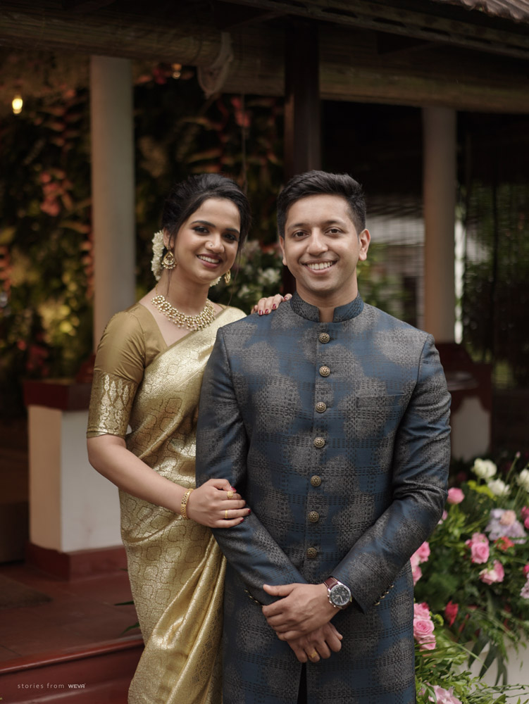 The regal engagement ceremony of our stunning couple Shikha & Gracious was inexplicably elegant in every single element. From enormous floral decor to a brief boat trip around the refreshing greens of Kumarakom backwaters, we are utterly speechless about the grace of their engagement bash held at Cocoon Lagoon – CGH Earth Resort. Shikha dolled up in a classic beige silk saree with a beautiful sheen. Her ‘into the camera eye’ portrait is quite a head-turner with her vibrant smile.