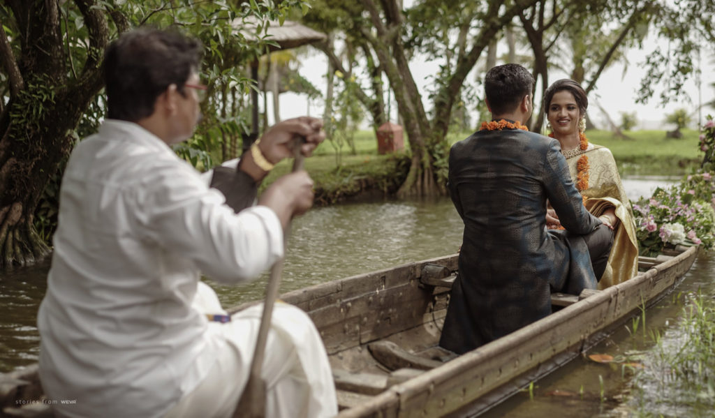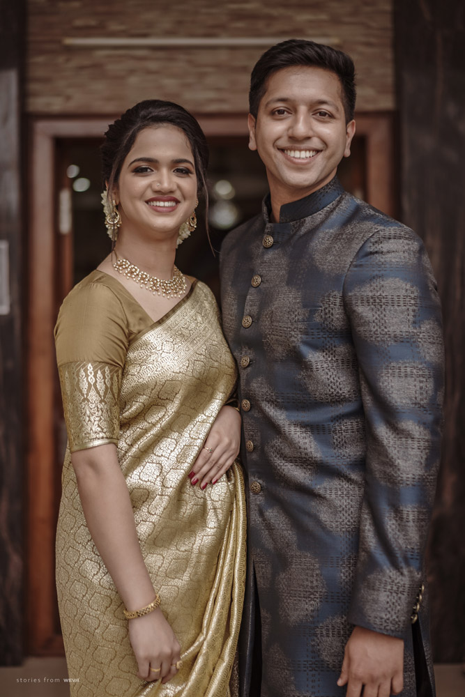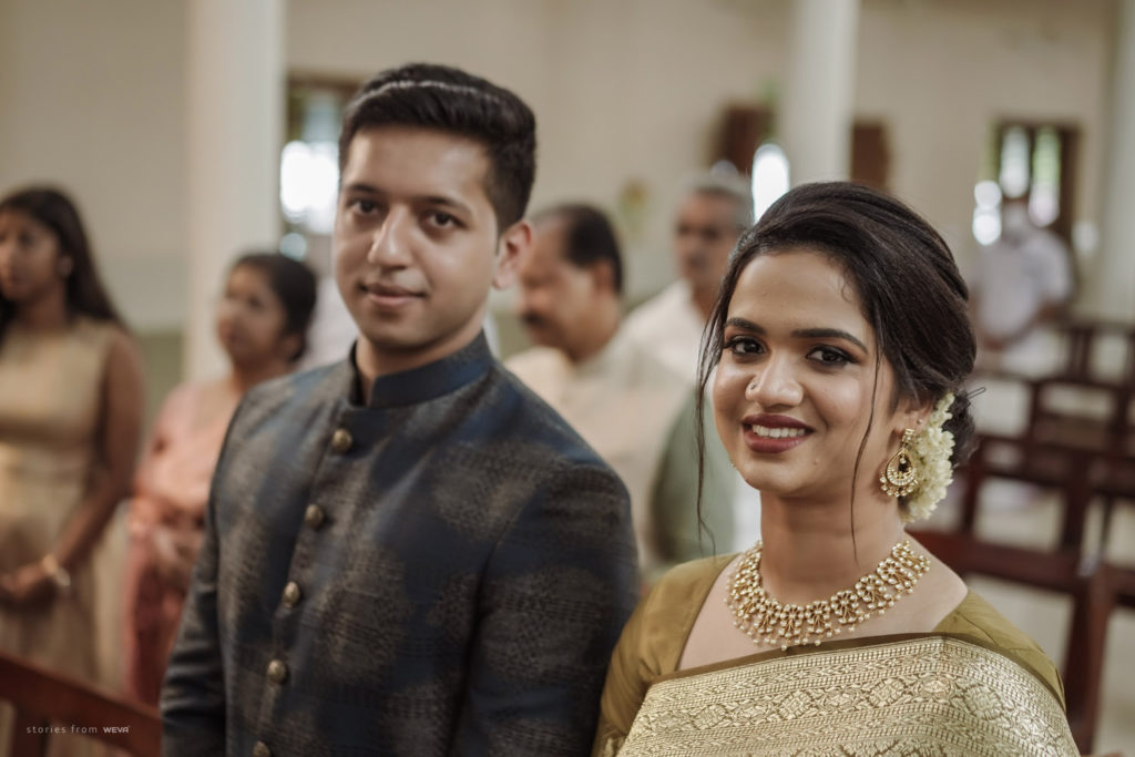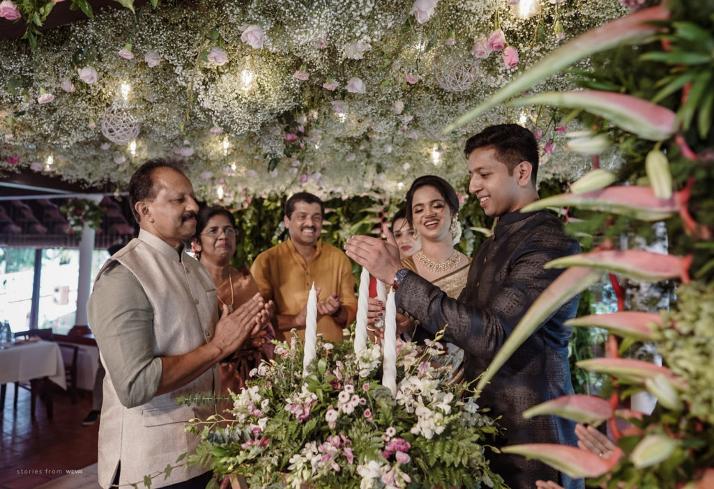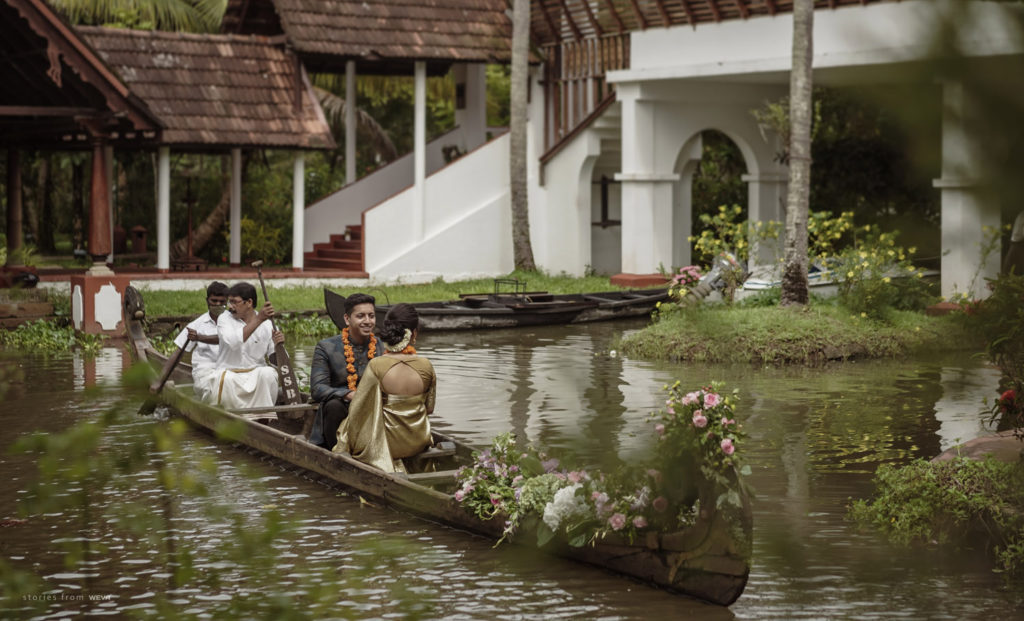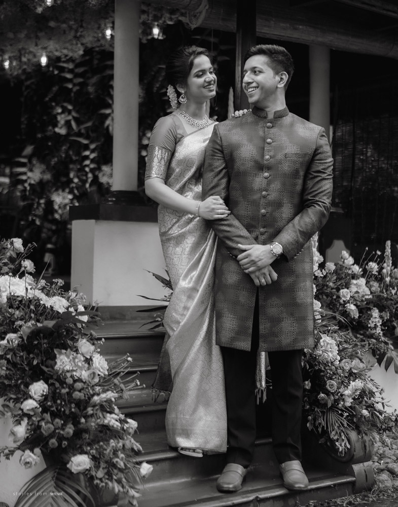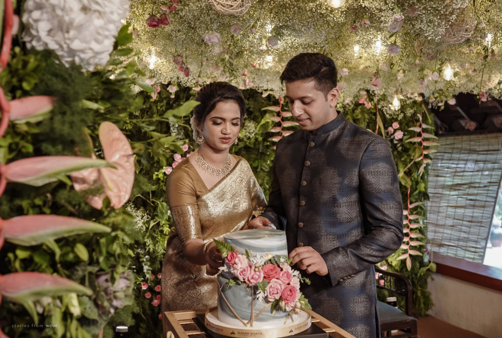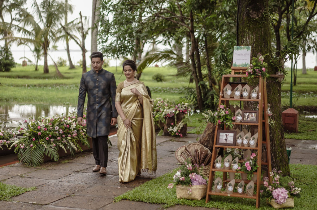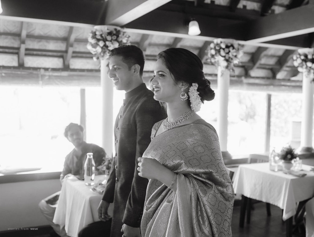 The regal engagement ceremony of our stunning couple Shikha & Gracious was inexplicably elegant in every single element. From enormous floral decor to a brief boat trip around the refreshing greens of Kumarakom backwaters, we are utterly speechless about the grace of their engagement bash held at Cocoon Lagoon – CGH Earth Resort. Shikha dolled up in a classic beige silk saree with a beautiful sheen. Her ‘into the camera eye’ portrait is quite a head-turner with her vibrant smile.