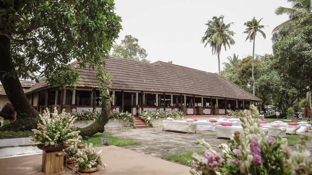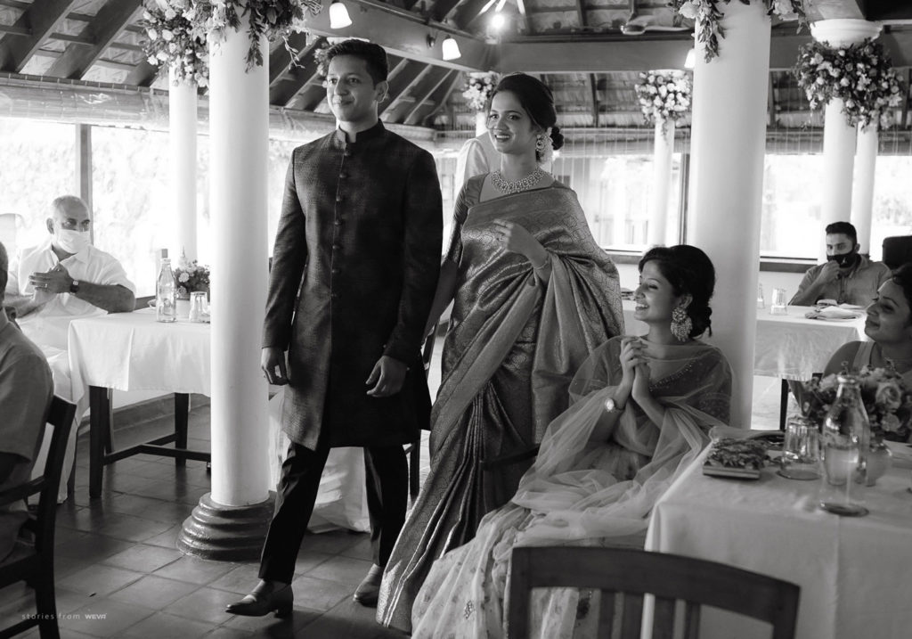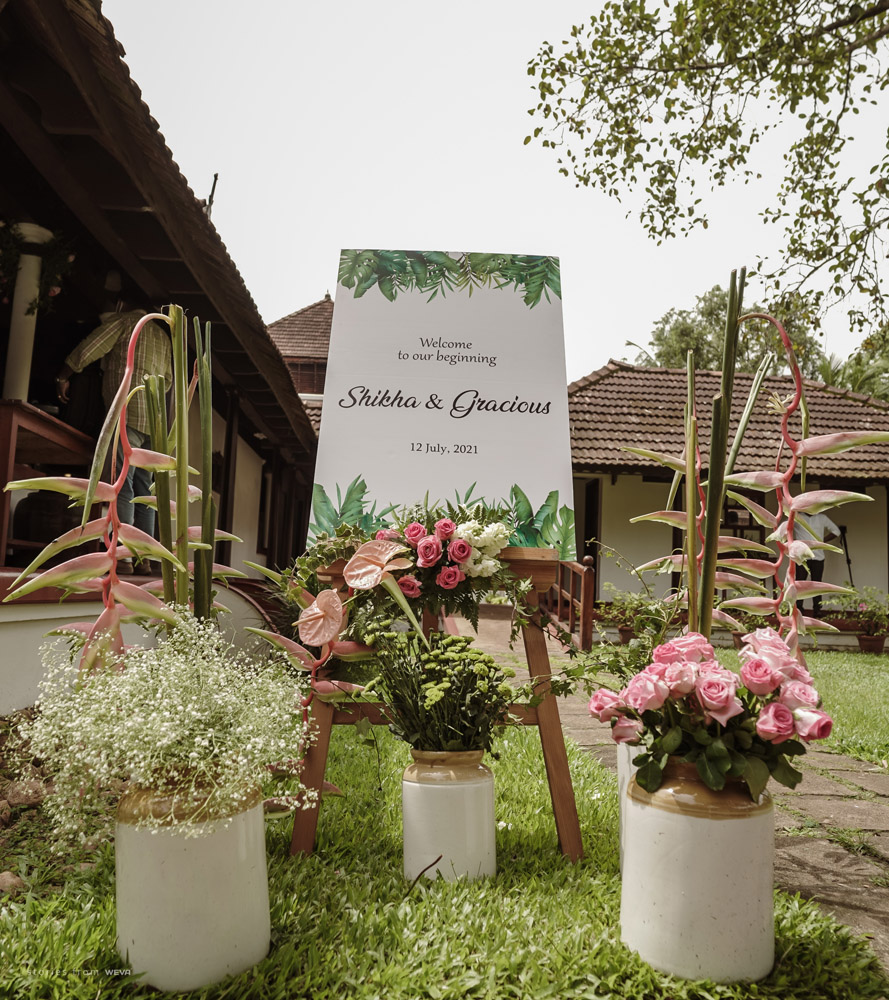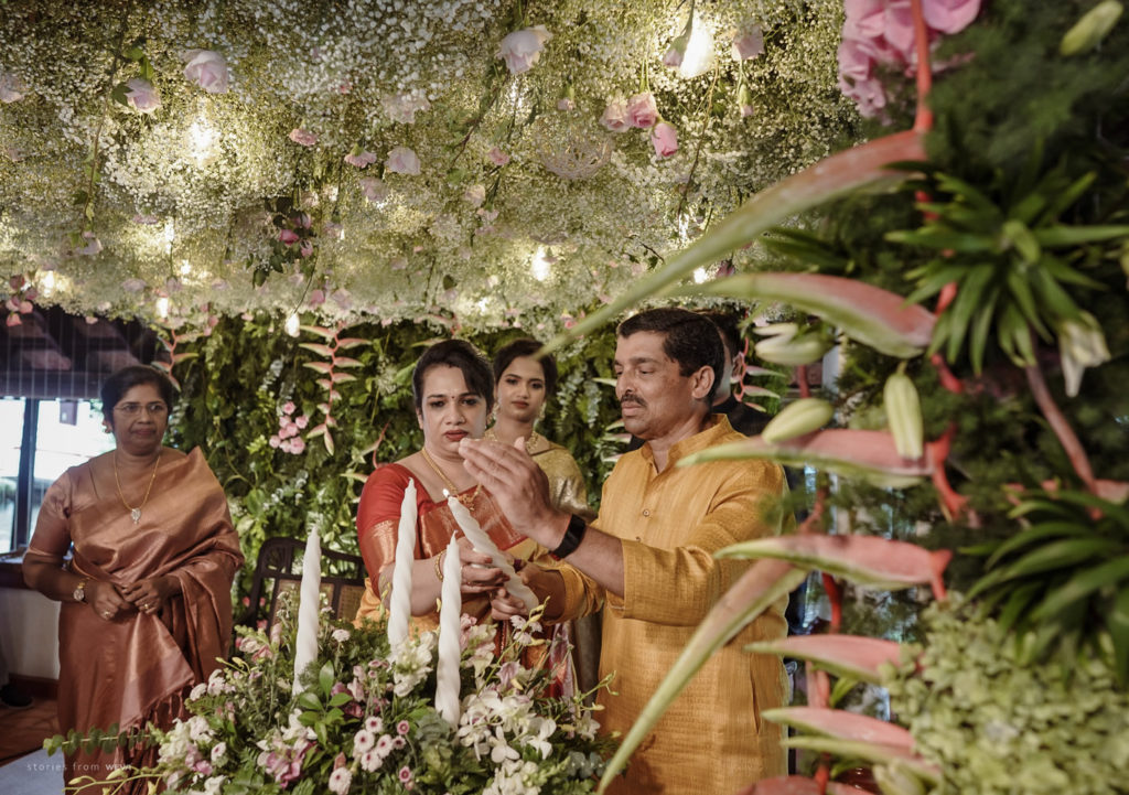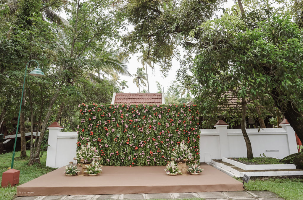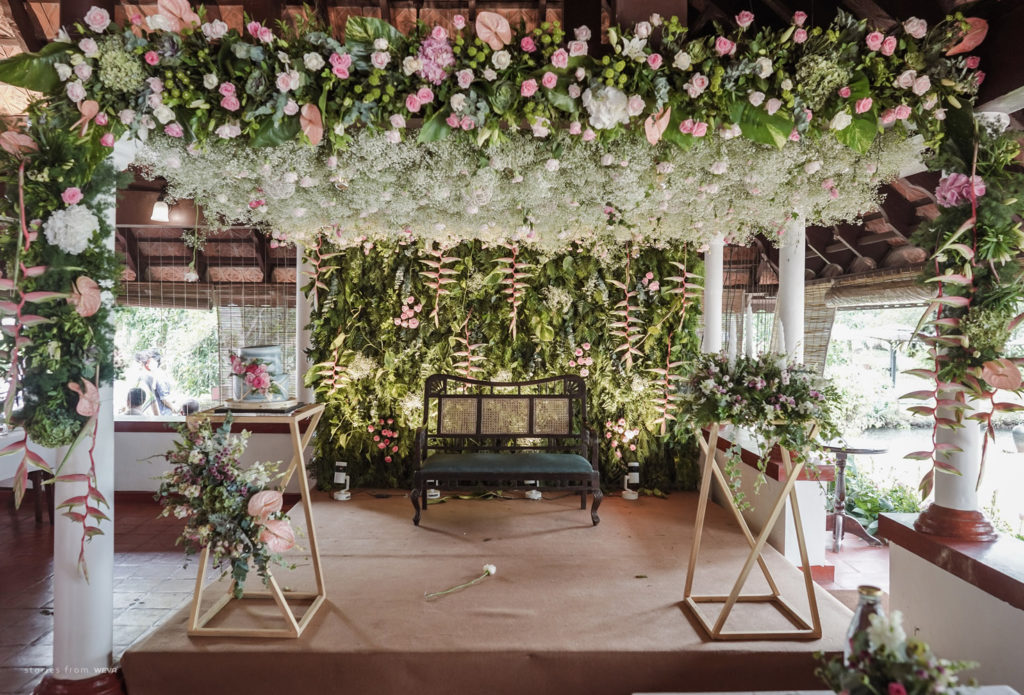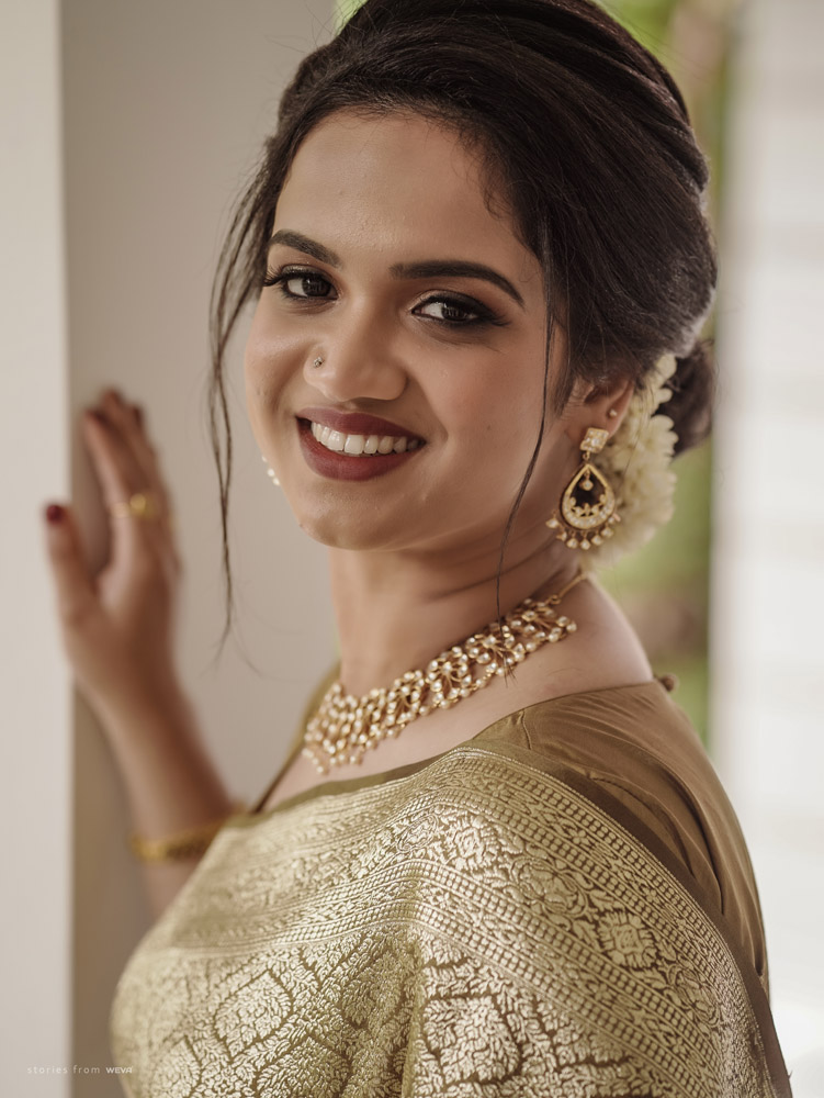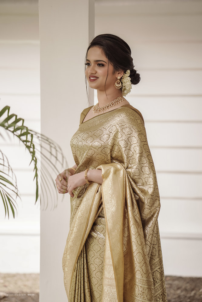 The regal engagement ceremony of our stunning couple Shikha & Gracious was inexplicably elegant in every single element. From enormous floral decor to a brief boat trip around the refreshing greens of Kumarakom backwaters, we are utterly speechless about the grace of their engagement bash held at Cocoon Lagoon – CGH Earth Resort. Shikha dolled up in a classic beige silk saree with a beautiful sheen. Her ‘into the camera eye’ portrait is quite a head-turner with her vibrant smile.