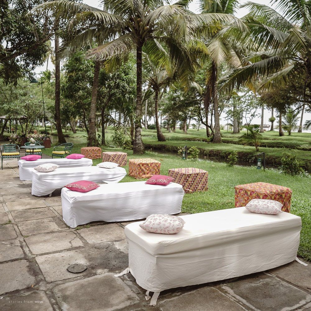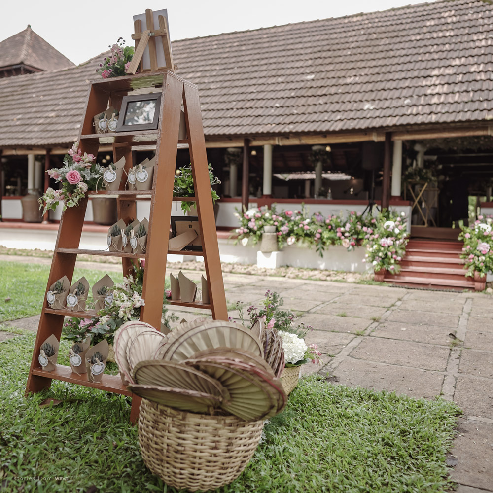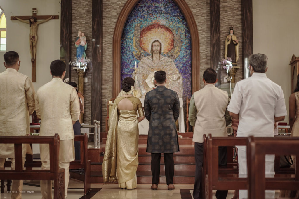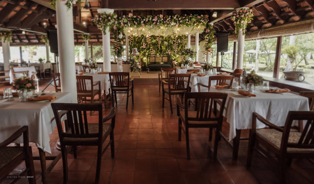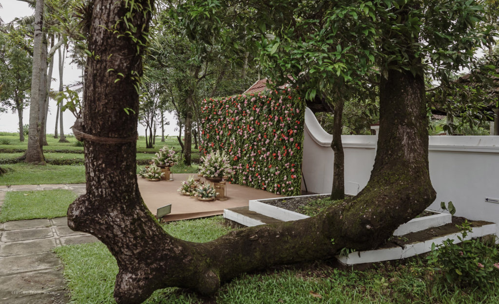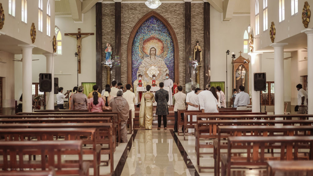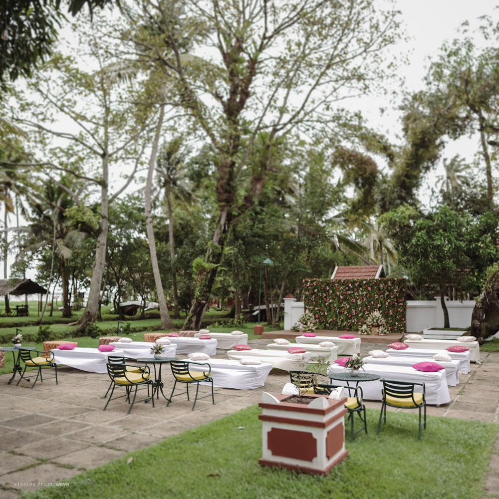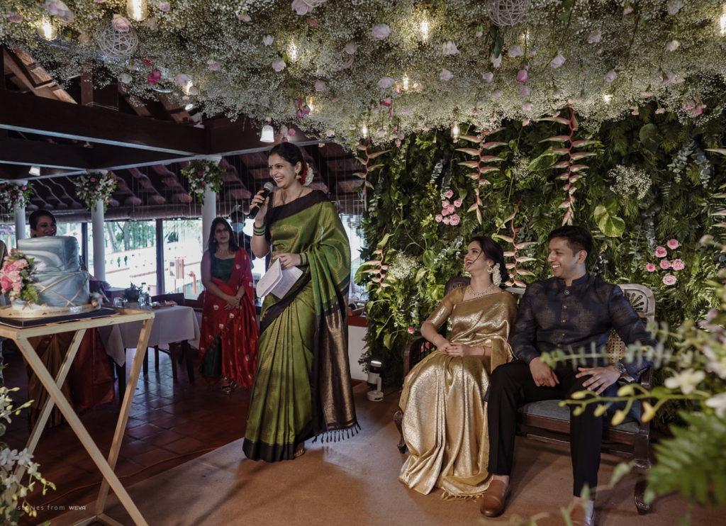 The regal engagement ceremony of our stunning couple Shikha & Gracious was inexplicably elegant in every single element. From enormous floral decor to a brief boat trip around the refreshing greens of Kumarakom backwaters, we are utterly speechless about the grace of their engagement bash held at Cocoon Lagoon – CGH Earth Resort. Shikha dolled up in a classic beige silk saree with a beautiful sheen. Her ‘into the camera eye’ portrait is quite a head-turner with her vibrant smile.